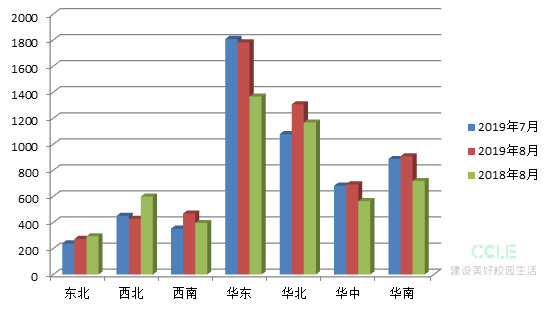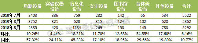 从上述数据可以看出,后勤设备的占比最高,其招标采购的信息量较大。环比来看,后勤设备、实训设备、音体美设备、其他设备继续有一定程度的增长,其他类别的设备皆出现一定程度的下降。同比来看,除后勤设备与实训设备有增长外,其他类别设备均有不同程度的下降,其中信息化设备同比下降幅度较大。后勤设备在8月份数据的持续增长,可以看出后勤设备在暑期的需求量较高。