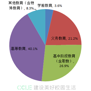 8月份招标采购信息所属领域统计情况如图6所示:学前教育占比为3.6%;义务教育占比为21.2%;高中阶段教育(含职教)占比为26.9%;高等教育占比为40.1%;其他教育(含特殊教育)占比为8.3%。