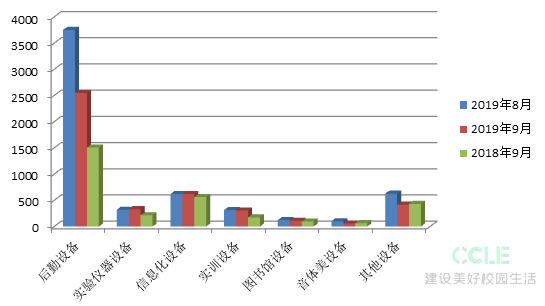 9月份各类别教育装备招标采购信息量对比情况如上图所示:后勤设备招标采购信息环比下降32.01%,同比增长69.28%;实训设备招标采购信息环比下降2.54%,同比增长75.43%;实验仪器设备招标采购信息环比增长3.43%,同比增长54.42%;信息化设备招标采购信息环比增长0.16%,同比增长9.91%;音体美设备招标采购信息环比下降44.12%,同比下降12.31%;图书馆设备招标采购信息环比下降11.29%,同比增长13.40%;其他设备招标采购信息环比下降33.44%,同比下降3.24%。