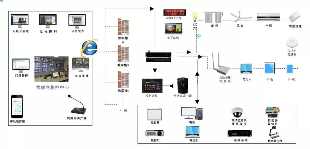 物联网智慧教室包括多媒体一体机、电脑、投影机以及电动窗帘、智能灯光、智能风扇等;学校的视频监控系统、门禁系统、广播系统、可视对讲系统、电子班牌、网络LED屏信息发布、一卡通系统等,学校所有教室以及其他区域全部能够实现集中管理网络、可视化管理,同时通过前端物联网设备进行数据采集,对采集数据进行大数据的分析展示等。
