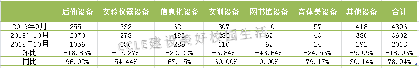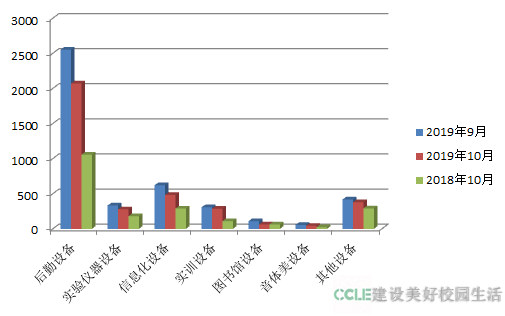 10月份各类别教育装备招标采购信息量对比情况如上图所示:后勤设备招标采购信息环比下降18.86%,同比增长96.02%;实训设备招标采购信息环比下降6.84%,同比增长160.00%;实验仪器设备招标采购信息环比下降16.27%,同比增长54.44%;信息化设备招标采购信息环比下降22.22%,同比增长67.13%;音体美设备招标采购信息环比下降24.56%,同比增长79.17%;图书馆设备招标采购信息环比下降43.64%;其他设备招标采购信息环比下降9.09%,同比增长30.14%。