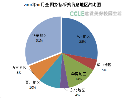 从10月招标采购信息地区统计图和全国招标采购信息量地区占比图可以看出:华东地区招标采购信息量为1112条,占比31%;华北地区招标采购信息量为1017条,占比28%;华南地区招标信息采购量为526条,占比14%;西北地区招标采购信息量为380条,占比10%;西南地区招标采购信息量为275条,占比8%;华中地区招标采购信息量为175条,占比5%;东北地区招标采购信息量为137条,占比4%。