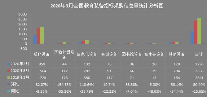 3月份各类别教育后勤装备招标采购信息量相较于2020年2月的环比及2019年3月份教育后勤招标采购信息的同比对比情况:后勤设备招标采购信息环比增长82.07%,同比下降9.23%;