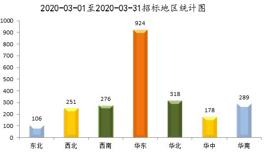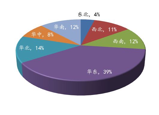 华东地区招标采购信息量为924条,占比39%;华北地区招标采购信息量为318条,占比14%;华南地区招标信息采购量为289条,占比12%;西南地区招标采购信息量为276条,占比12%;西北地区招标采购信息量为251条,占比11%;华中地区招标采购信息量为178条,占比8%;东北地区招标采购信息量为106条,占比4%。