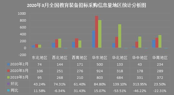 其中后勤设备招标采购信息共计1564条,占66.90%;3月招标采购信息环比增长80.40%,同比下降15.63%。受到新冠肺炎疫情对全国教育装备招标采购的影响,全国教育的装备招标采购相较于与去年同期下降明显。