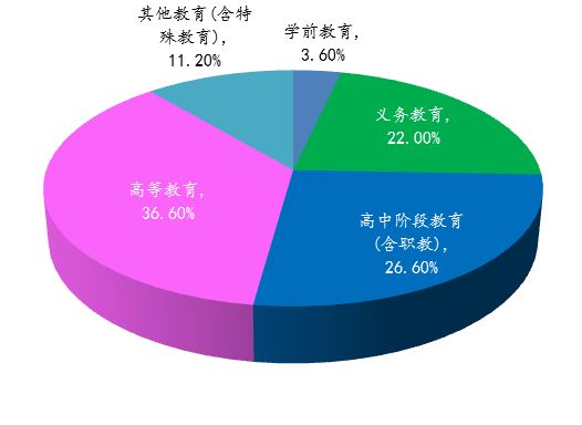 学前教育占比为3.6%;义务教育占比为22.0%;高中阶段教育(含职教)占比为26.6%;高等教育占比为36.6%;其他教育(含特殊教育)占比为11.2%。