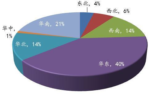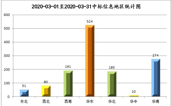 华东地区中标信息量为524条,占比40%;华南地区中标信息为274条,占比21%;西南地区中标信息为191条,占比14%;华北地区中标信息为185条,占比14%;西北地区中标信息为80条,占比6%;东北地区中标信息为51条,占比4%;华中地区中标信息为10条,占比1%。