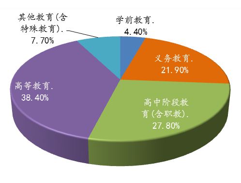 学前教育占比为4.4%;义务教育占比为21.9%;高等教育占比为38.4%;高中阶段教育(含职教)占比为27.8%;其他教育(含特殊教育)占比为7.7%。