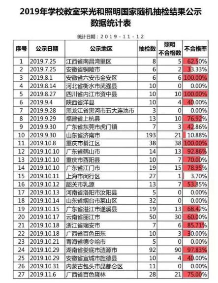 不知道看到这样的数据,家长们是不是捏了一把汗!居然有一半以上教室照明不合格,其中,安徽省六安市金安区、四川省内江市资中县、重庆市綦江区教室照明不合格率为100%;另外,广东省鹤山市、浙江省瑞安市、福建省上杭县等11个地区教室照明不合格率均大于50%。