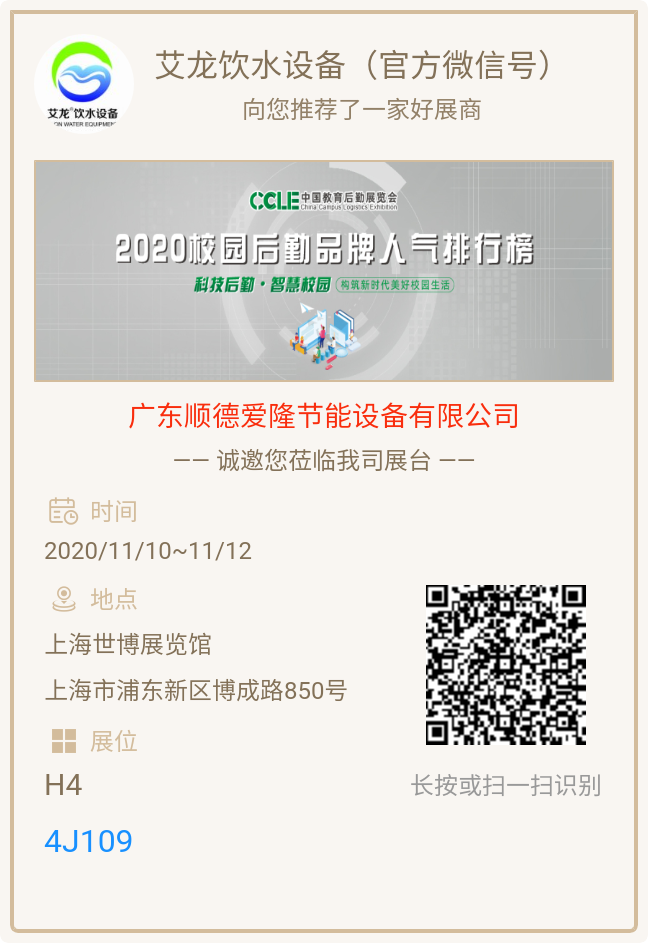 一直以来,艾龙饮水品牌不仅引领校园饮水设备行业的快速发展,更是节能饮水设备技术创新的先驱者。艾龙产品将在中国金年会览会亮相,届时,还会有来自全国各地的行业专家莅临现场。