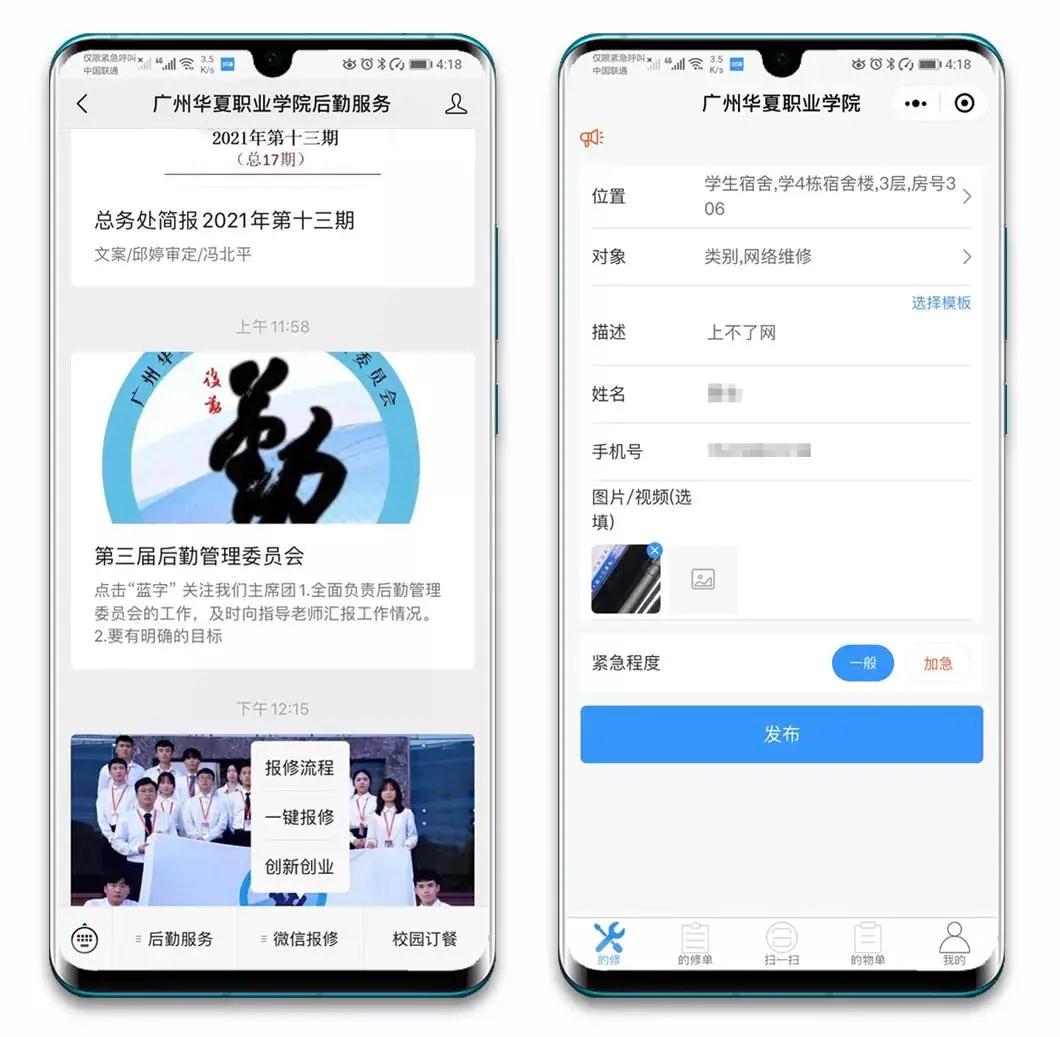 2.维修端可上传现场图片或视频,对人为损坏情况可进行项目报价,由学生在线支付后维修;