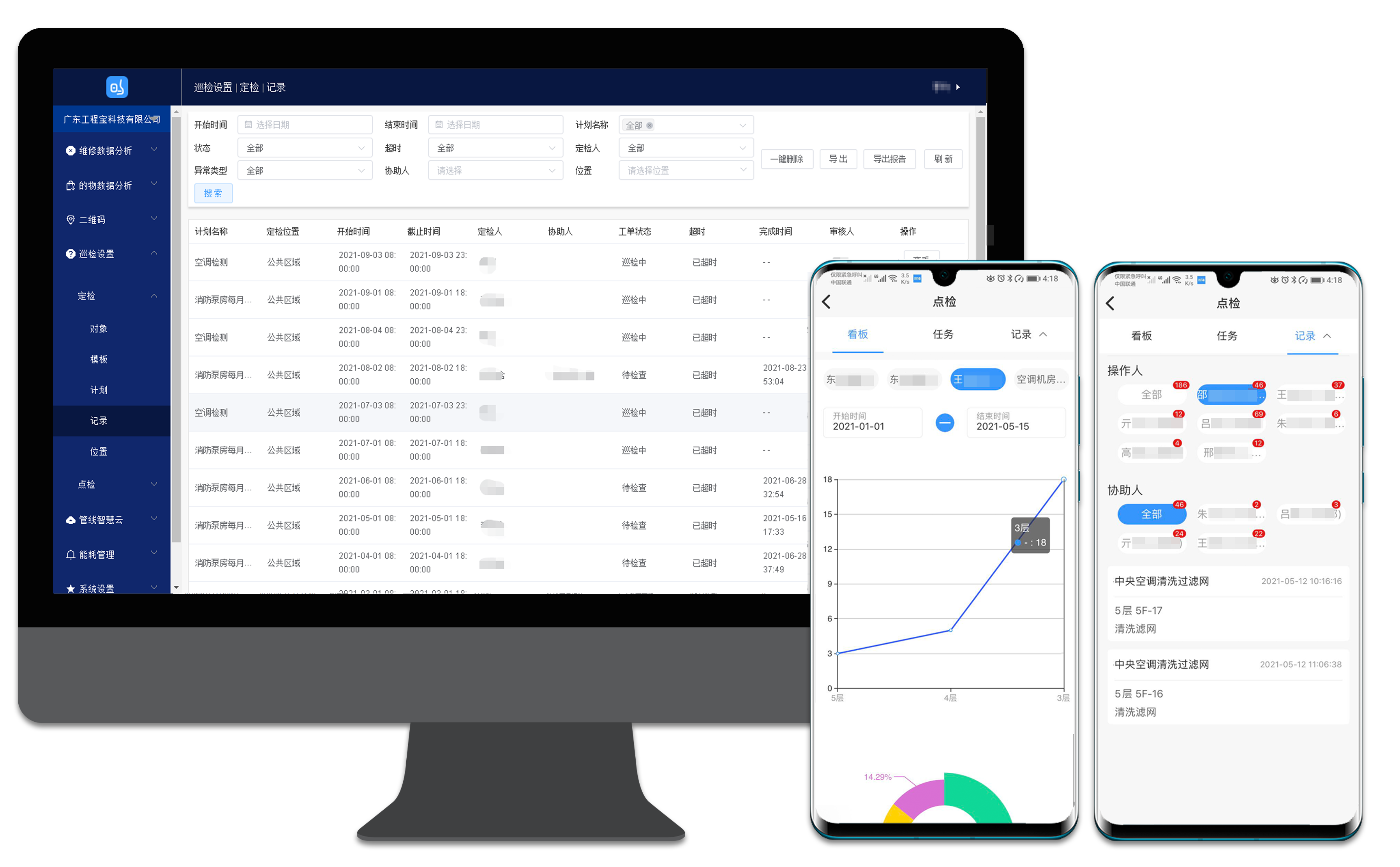 3.移动端、PC端后台实时记录维修过程,实现从报修、派工、维修、验收、评价等全流程跟踪服务管理,并通过大屏呈现的工单量、报修率、故障原因、维修超时、返修单、差评单等数据分析结果,对员工进行量化考核,制定维护决策,确保设备的正常运行。