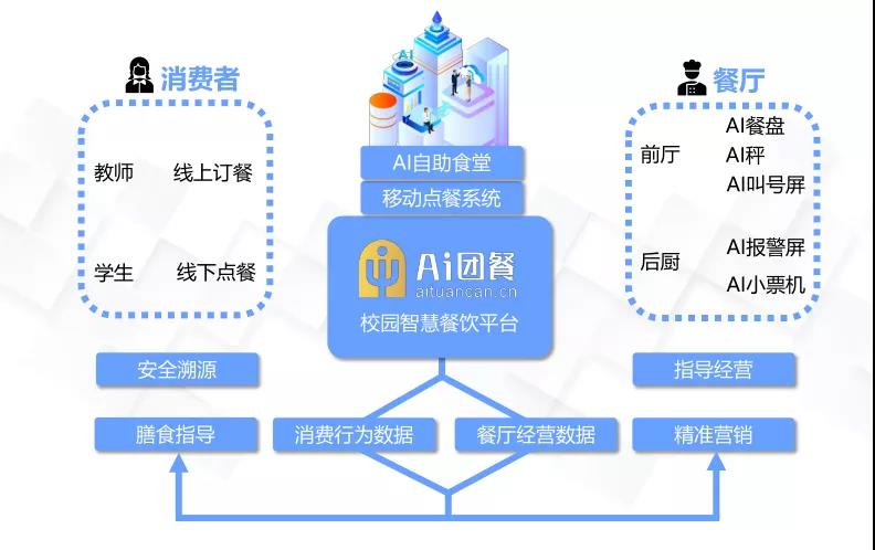 以高校师生群体为核心对象,自主设计研发校园智慧食堂“智能化团餐硬件+Saas系统+AI数据平台”综合服务管理系统(简称:校园AI餐饮平台),并与各高校联合,以校园智慧食堂为应用场景,建立AI产学研实验室,用科技为高校赋能,强化校园饮食健康及安全,践行光盘行动,减少浪费。