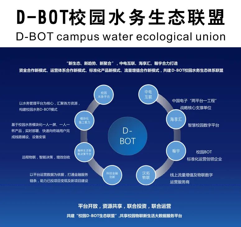 中国水务集团、中电互联、海享汇、翰宇新能源合力打造资金合作新模式、智能决策运营管理新模式、标准化产品方案新模式、流量增值新模式,共建D-BOT校园水务生态体系联盟。