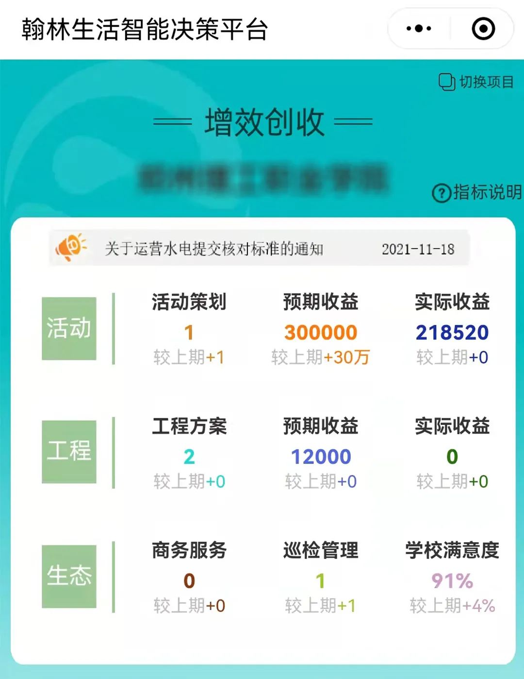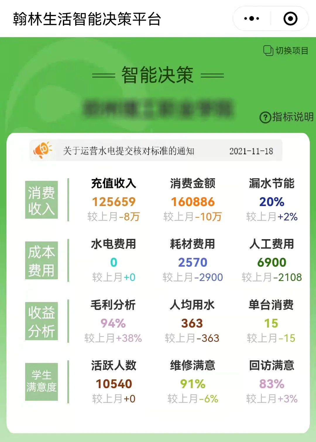 翰宇新能源公司团队研发了行业领先的“翰林生活-智能决策平台”,通过设备物联、智能决策、增效创收三个核心板块及四大角色服务,升级了原有项目管理和运营模式,真正实现项目经营的自助式分析,让每一个运营商都能充分了解每个项目经营数据和运营质量,辅助决策,提升服务及时性和学生满意度,为整个项目全流程运营管理提供必要的决策管理需求。