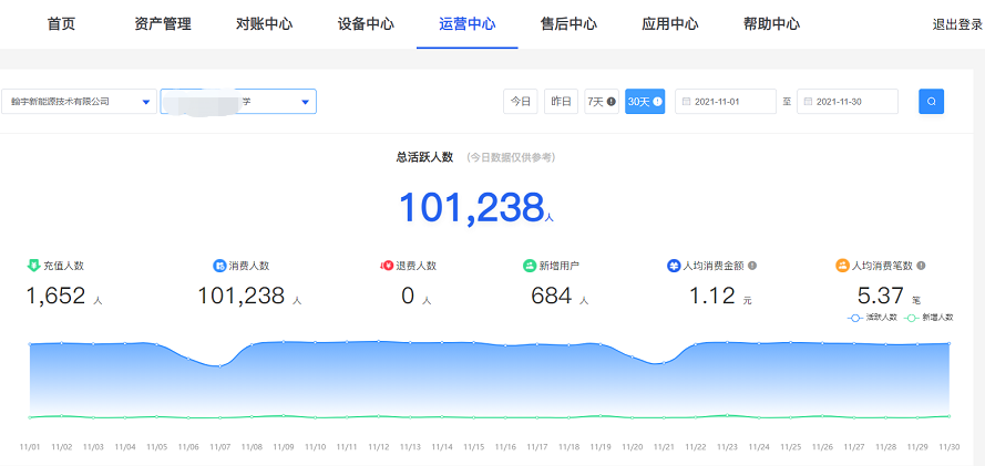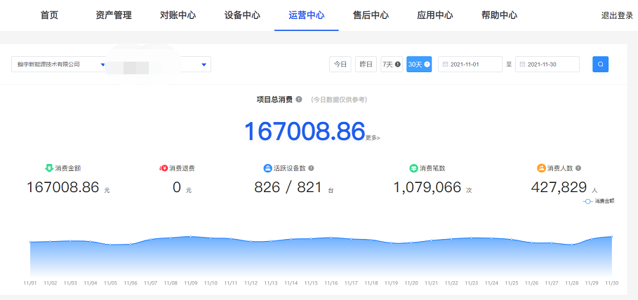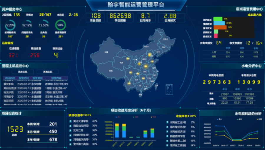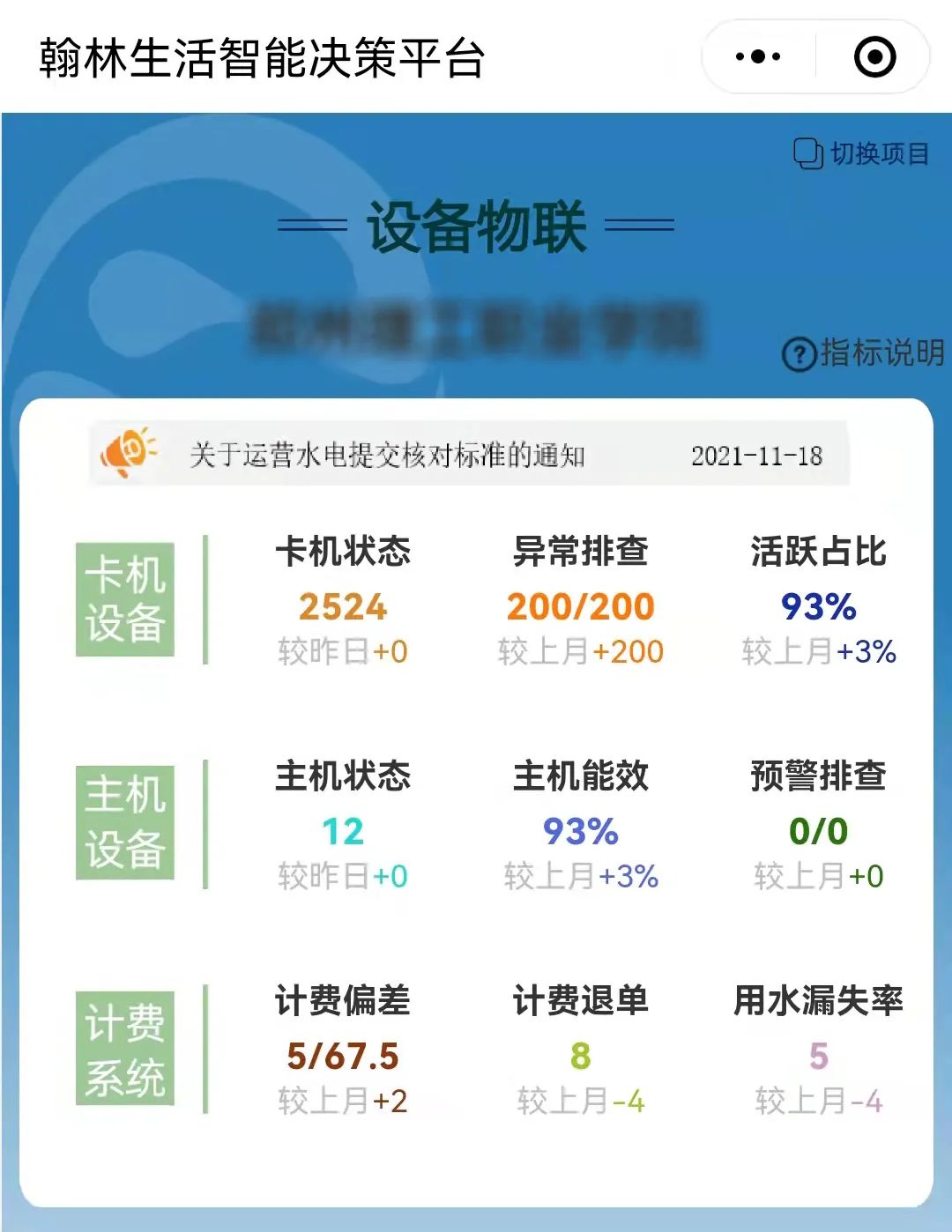 设备物联板块从卡机、主机和计费平台,对项目核心经营指标进行智能化的预警和分析。