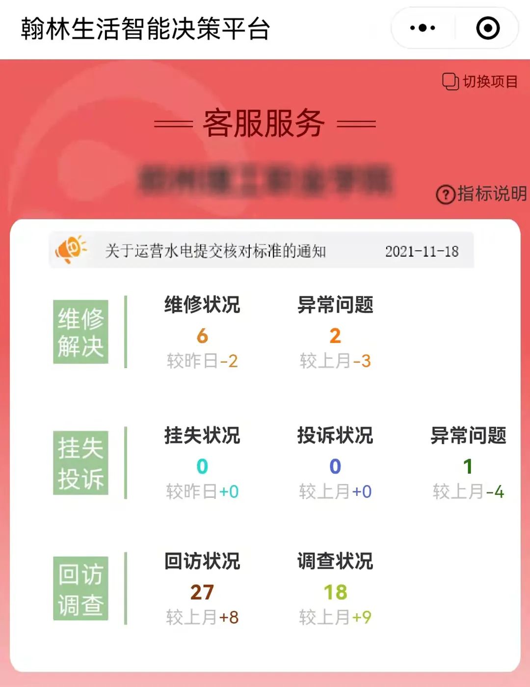 客服服务板块从客服人员的维修跟单、挂失投诉处理、回访调查等几个方面,把日常工作量和关键问题反馈通过量化考核的方式,通过100%回访和主动回访调查等方式,用客服通道反馈学生群体问题和项目情况,确保项目服务的质量和效果。