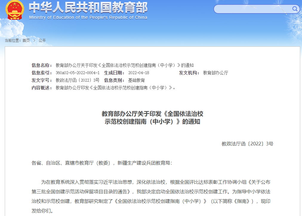 在2022年4月18日,教育部又研究制定了《全国依法治校示范校创建指南(中小学)》,其中7.2.1要求“建立学生欺凌防控工作机制,成立学生欺凌治理委员会,定期开展防欺凌教育、欺凌调查,能够客观认定、及时有效的处置学生欺凌事件”。