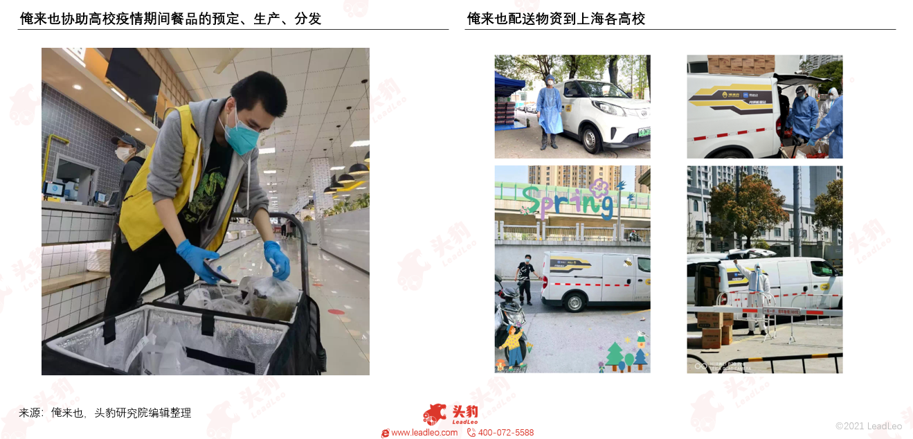 俺来也全面配合上海高校的管理部门,为高校提供防疫订餐系统,启动校园预定餐“疫情防疫实战方案”,解决餐品的预定、生产、分发,还采购爱心防疫礼包、小票机、小票纸、牛奶、口罩等相关物资配送到上海各高校;同时,俺来也联合光明、均瑶等企业,向东华大学、复旦大学、华东理工大学等高校捐赠防疫物资。