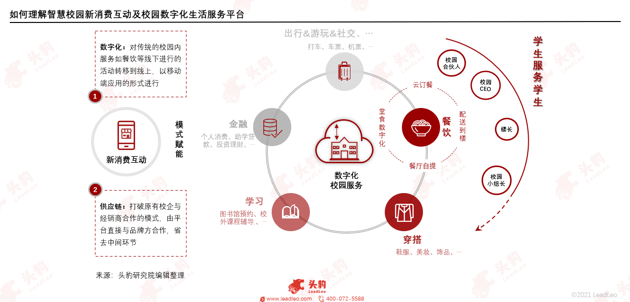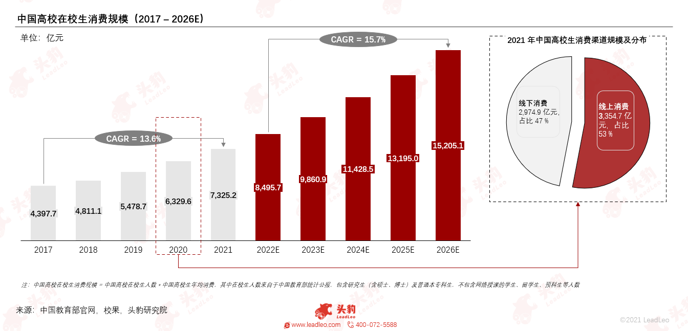 在疫情防控常态化的背景下,学生大部分的消费被圈定在校园内,同时由于学生对于线上消费的偏好,智慧校园新消费互动及校园数字化生活服务平台因此也得到了迅速发展。头豹研究院测算,到2026年中国高校在校生消费规模将达到 15,205.1亿元,也将为平台创造广阔的成长空间。