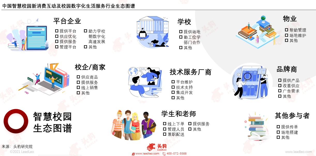 中国智慧校园行业参与者众多,包括平台企业、学校、校企/商家、用户、品牌商、技术服务厂商、物业以及其他参与者,行业参与者间相辅相成、合作共赢,形成了庞大的行业生态。