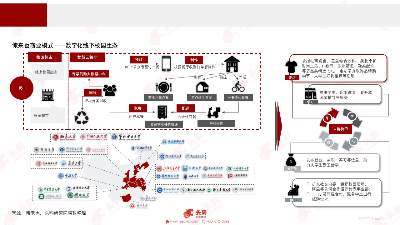阿里以饿了么建立服务以及流量入口,在原有用户存量中进一步细分人群需求,进场大学校园。依托原有电商零售等平台的庞大用户存量,阿里布局多业务矩阵协同合力,基于高校新餐饮、新零售和新生活的场景,塑造升级校园服务。
