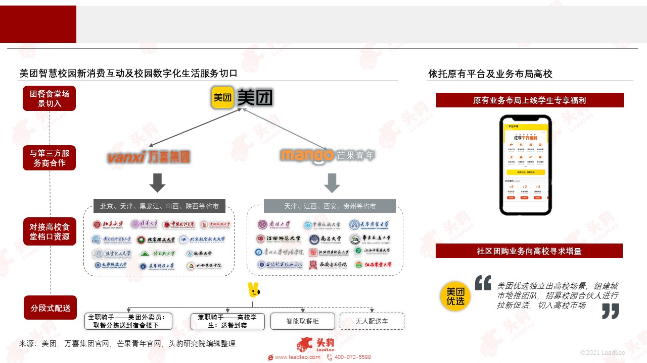 美团聚焦“零售+科技”新核心战略,从大众消费中细分并独立高校市场,从高校团餐食堂场景切入赛道。美团定位校内餐饮的补充延伸运营商,依托原有平台及业务布局,覆盖餐饮外卖、酒店旅游、社区电商等多场景,在高校消费生态内挖掘增量空间。