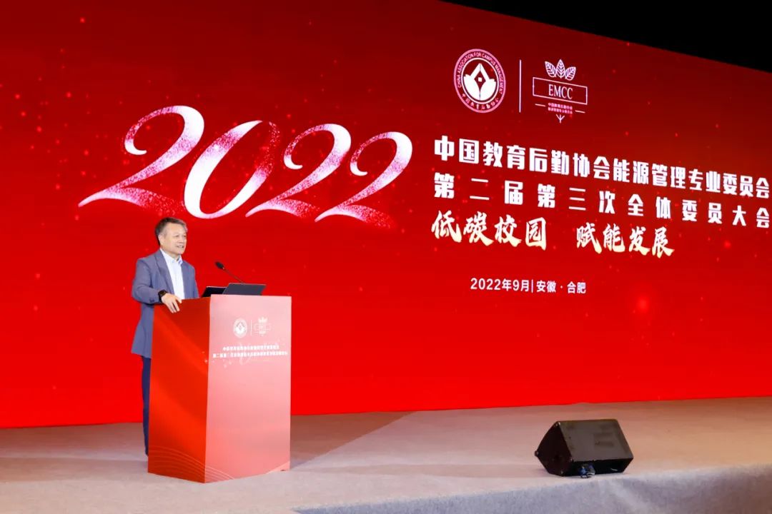 2022年9月14日,中国教育后勤协会能源管理专业委员会(以下简称“全国能专会”)第二届第三次全体委员大会暨中国教育节能(2022年度)发展论坛在安徽合肥召开。教育部发展规划司副司长晁桂明、国家节能中心宣传培训处处长陈仲伟、中国教育后勤协会常务副会长兼秘书长牛维麟、中国教育后勤协会能源管理专业委员会副主任、合肥工业大学党委常委、副校长季益洪通过线上或线下的方式参与大会开幕式。来自全国各地100余家委员单位在线下参与了此次会议,线上参会的委员单位达400余家,近20家优秀会员企业代表也参与了此次会议。会议由中国教育后勤协会副会长兼常务副秘书长黎玖高主持。