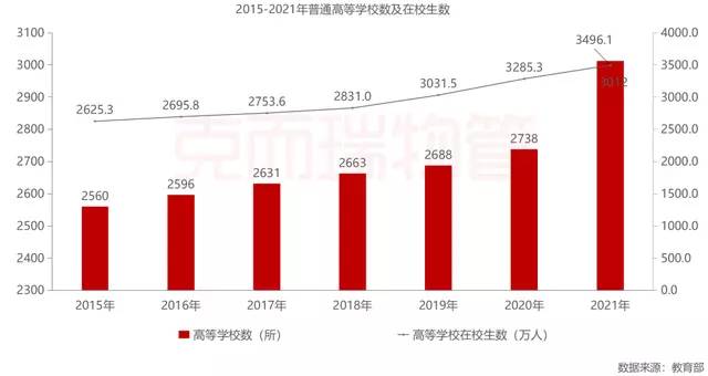 根据教育部公布的统计数据,2021年,我国各级各类学校数量为52.93万所,在校生2.91亿人。其中高等学校数量达到3012所,较2015年增加452所,复合增长率2.8%;在校生数由2015年的2625.3万人增长至2021年的3496.1万人,复合增长率为4.9%。各种形式的高等教育在学总规模4430万人。由此可见,我国普通高校及在校生数量均呈现持续增长态势,为高校物业管理服务带来巨大市场空间。