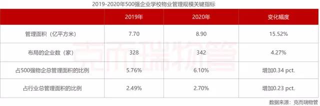 学校物管潜在的市场规模让众多物业企业盯上这块蛋糕。克而瑞物管数据显示,2020年,500强企业中有342家企业涉足学校物业服务,占比68.4%,较2019年略有提升。同时,500强企业学校物业总管理面积达8.9亿平方米,同比增加15.52%。