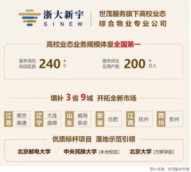 世茂服务在2020年8月收购了浙大新宇51%股份,首次涉足高校业态。2021年5月,世茂服务旗下浙大新宇“智育美好宇同行”全新品牌形象正式亮相,新定位是“中国高校园区服务商”,并发布了行业首个针对“校园后勤服务”研发的“宇林校园服务生态”,此次品牌焕新是高校后勤与物业管理的首次跨界融合。