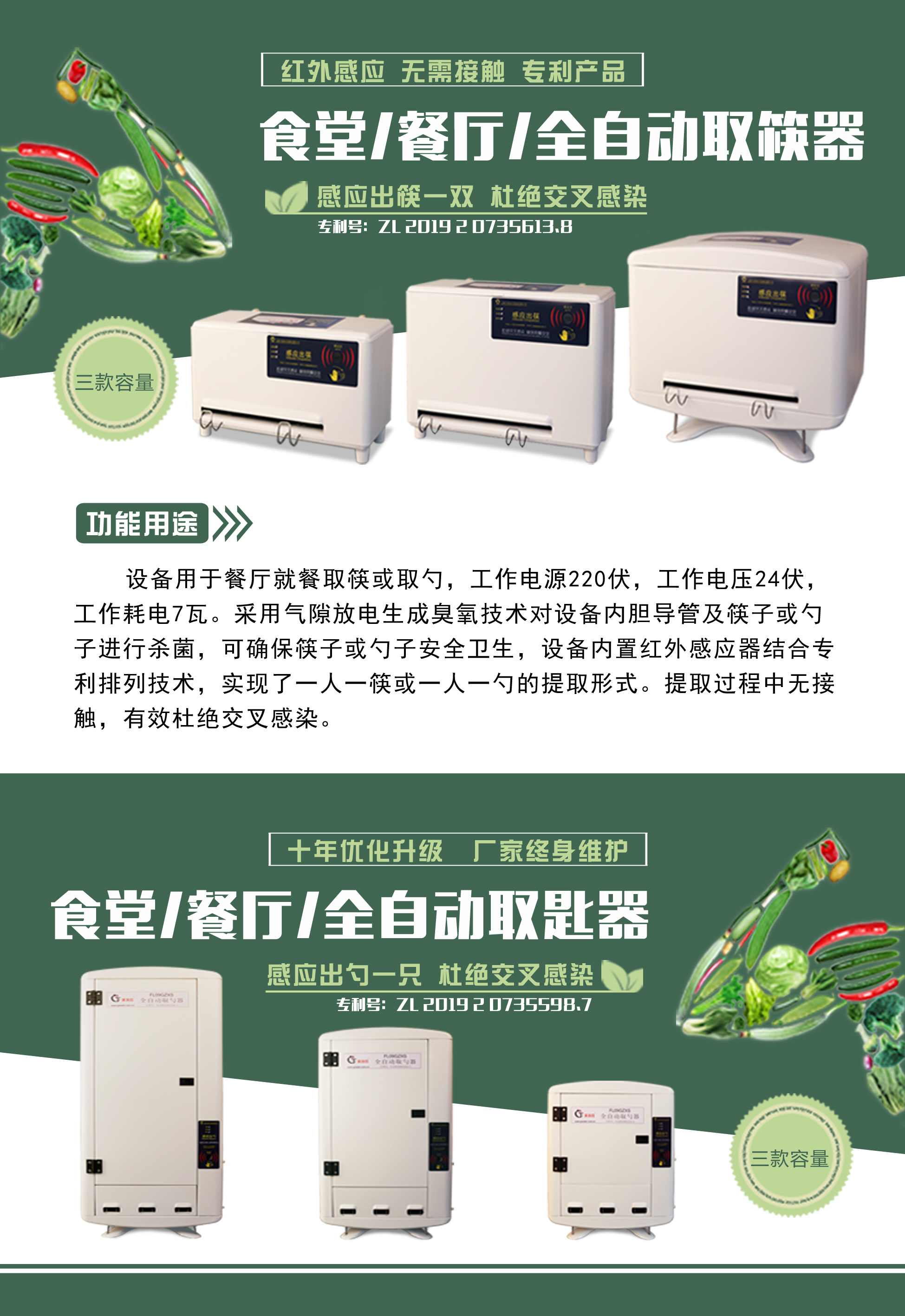 飞龙电子此次在展会将要展示的产品主要用于餐厅就餐取筷或取勺。产品工作电源220伏,工作电压24伏,工作耗电7瓦。采用气隙放电生成臭氧技术对产品内部及筷子或勺子进行杀菌,可确保筷子或勺子安全卫生,产品内置红外感应器结合专利排列技术,实现一人一筷或一人一勺的提取形式,可有效杜绝交叉感染发生。