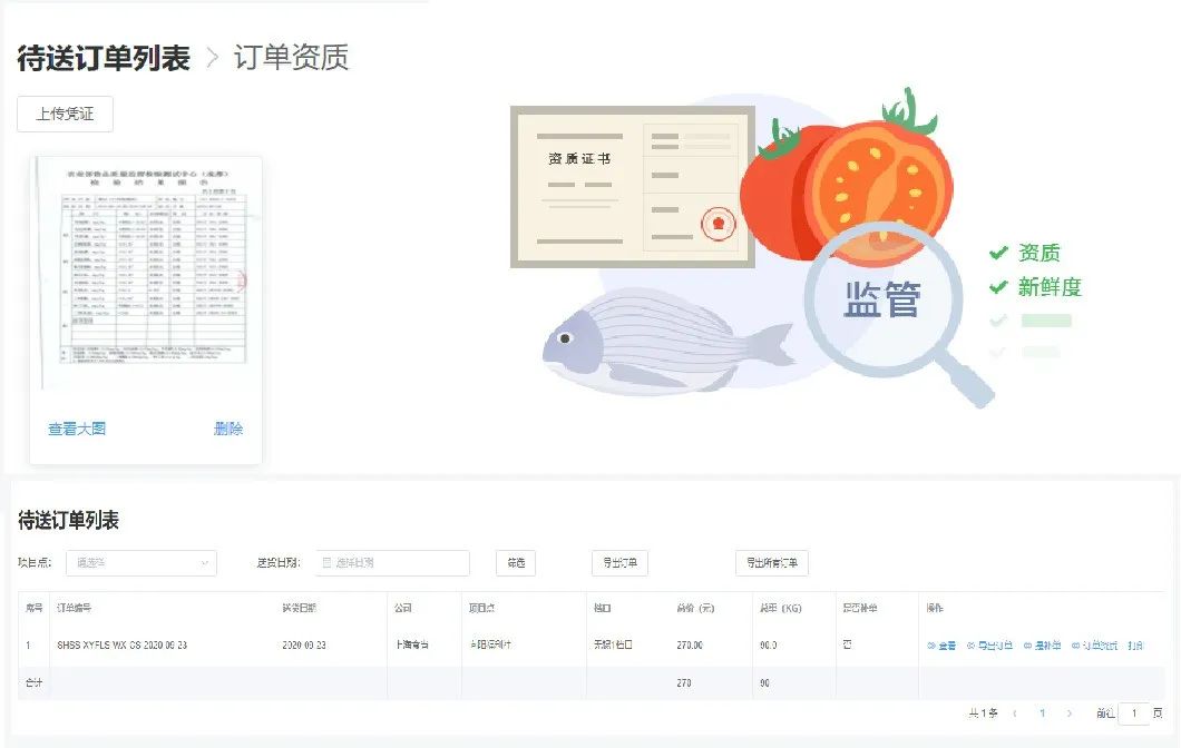 1、食品追溯:即时上传订单的农残检测报告、肉类溯源凭证,确保订单食材安全可溯源。