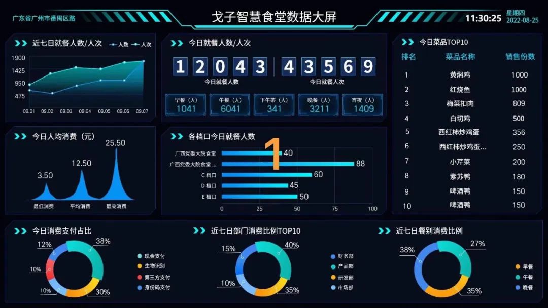 1、智能监控大屏,实时掌握食堂运营态势,及时做出运营调整。