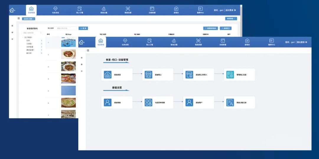 1、支持多食堂分级管理,每个食堂具有独立管理权限,能够管理用户、子食堂、餐别、菜品等信息。