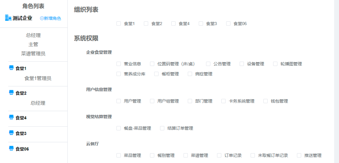 支持人员组织机构及权限角色的配置,满足食堂人员权限的需求。企业可根据食堂或企业内部管理人员身份,创建员工账号并分配角色。
