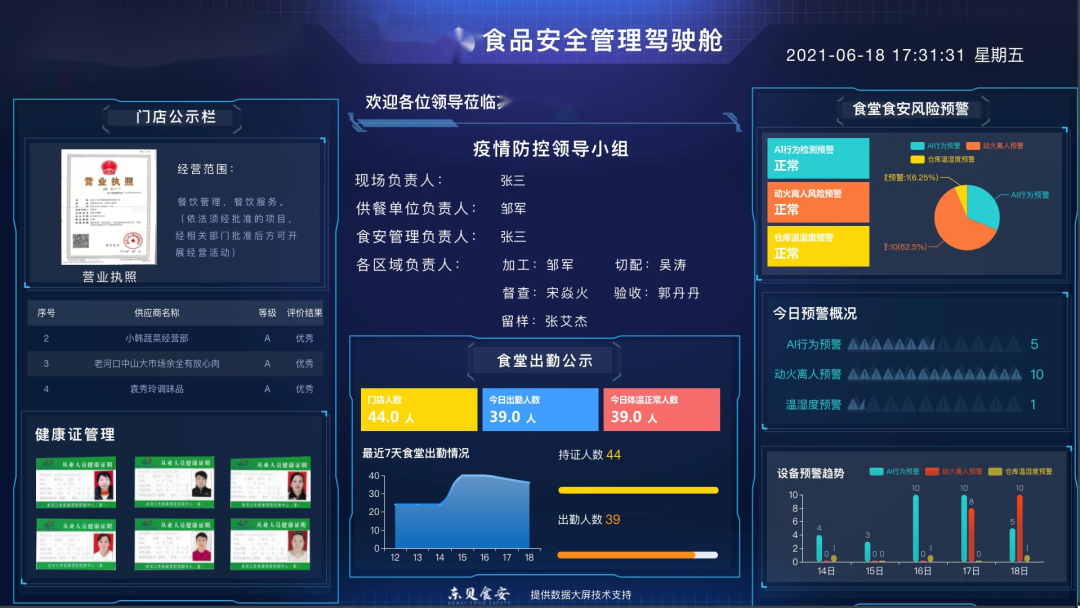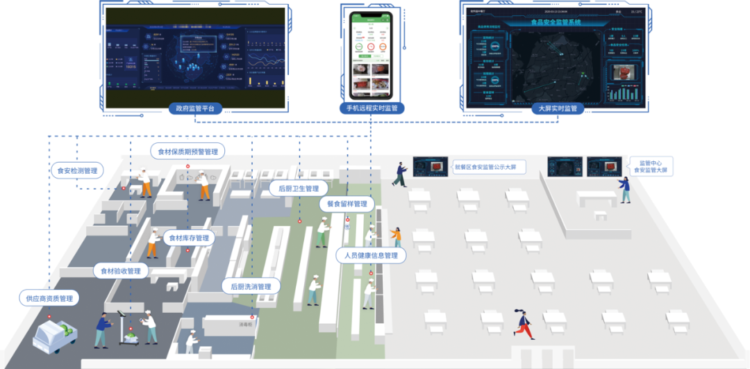 通过人脸识别、行为识别、火灾识别、温湿度识别等对后厨安全隐患进行实时监控,数据预警和风险消除。