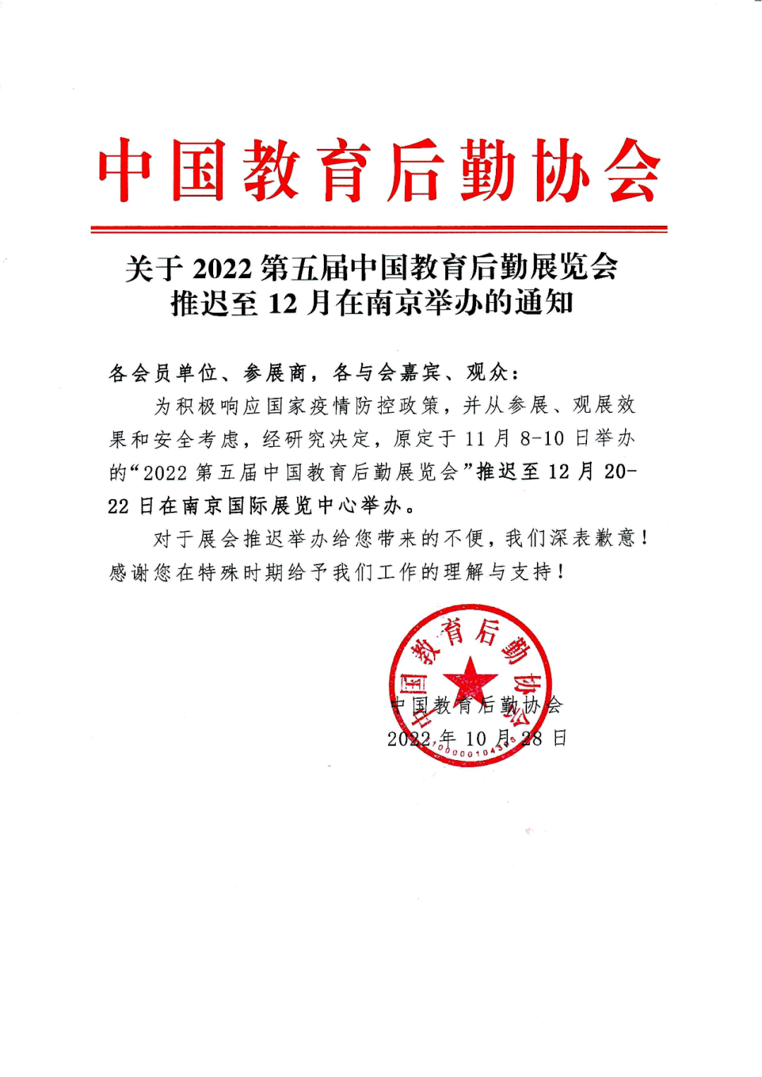 为积极响应国家疫情防控政策,并从参展、观展效果和安全考虑,经研究决定,原定于11月8-10日举办的“2022第五届中国金年会览会”推迟至12月20-22日在南京国际展览中心举办。