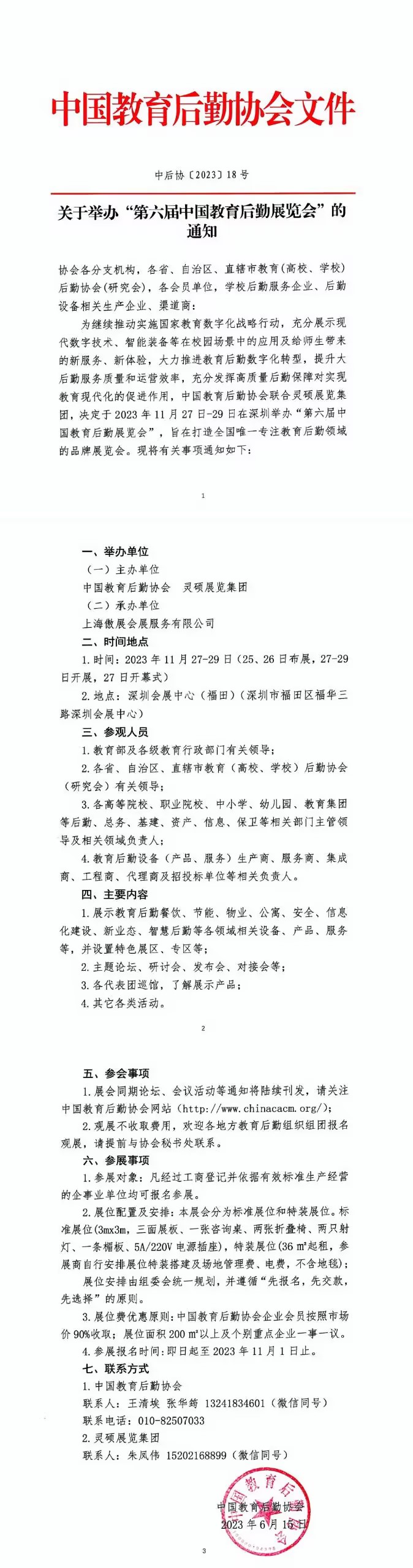 为继续推动实施国家教育数字化战略行动,充分展示现代数字技术、智能装备等在校园场景中的应用及给师生带来的新服务、新体验,大力推进教育后勤数字化转型,提升大后勤服务质量和运营效率,充分发挥高质量后勤保障对实现教育现代化的促进作用,中国教育后勤协会联合灵硕展览集团,决定于2023年11月27日-29 日在深圳举办“第六届中国金年会览会”,旨在打造全国唯一专注教育后勤领域的品牌展览会。