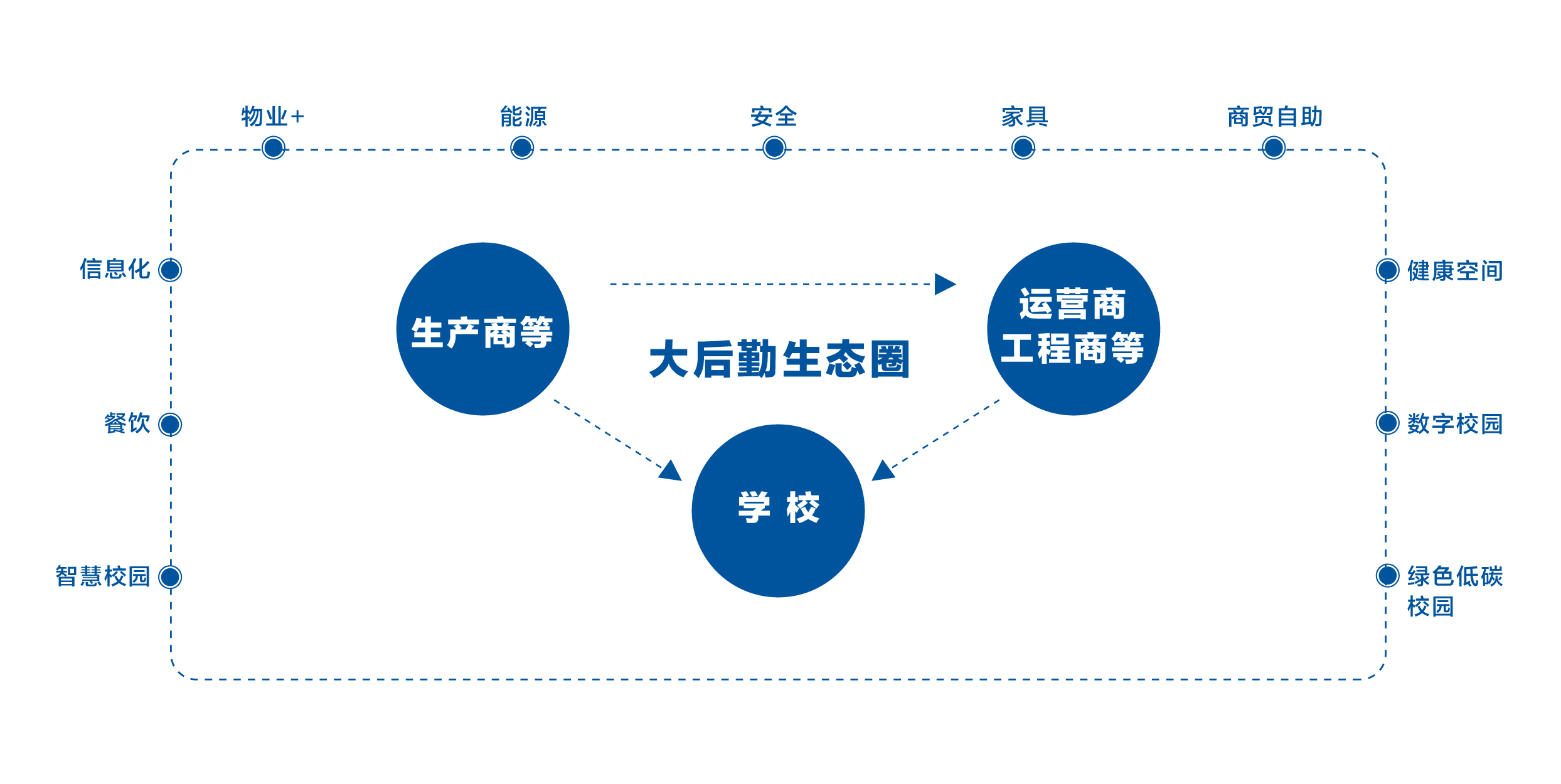 专注校园管理服务,涉及校园餐饮、能源、安全、信息化、物业、公寓、商贸、建设与修缮等方面,已发展成为全国教育后勤领域品类最全、专业度最高、影响力最大的“大后勤生态交流圈”。