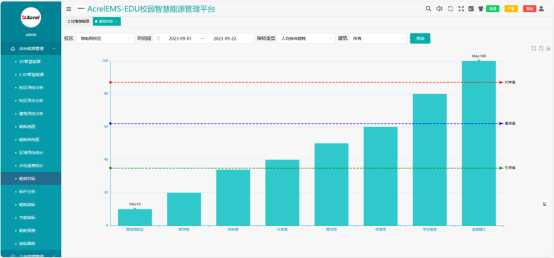 能效对标:可基于基准年的人均/面均能耗进行对标;对标基准值可选择画像管理中的基准能耗模型的配置值,也可自定义基准值;支持对对标结果导出excel。