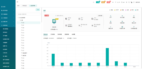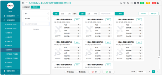 房间监控:系统能够按照校区->楼栋->楼层等多级拓扑筛选查看房间预览,可直观展现任一层级下的所有宿舍情况,包括剩余金额、用电量、用电状态等参数。点击可查看宿舍用电详情。