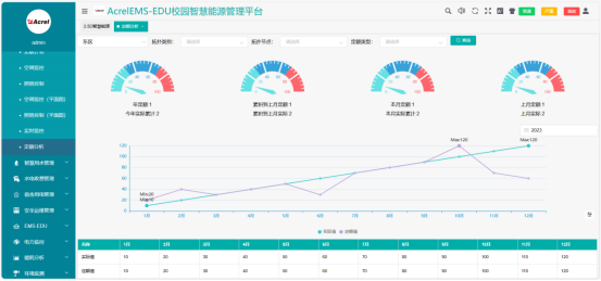定额分析:按建筑、学院、区域、回路进行查询,对所选对象当前定额指标使用情况进行分析,显示年定额、当年累积到上月定额、本月定额、上月定额、月定额对比,以仪表盘、折线图、列表等方式呈现。