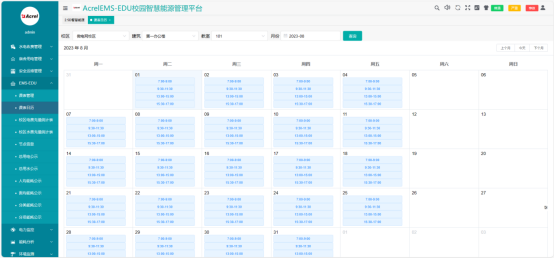 课表日历:维护各教室的课表日历,展示每天的上课时段,可导入课表,用于教室设备定时控制。