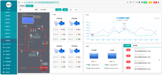水泵监测:实时监测学校水泵运行状态及管道压力,确保水泵设备的安全运行。