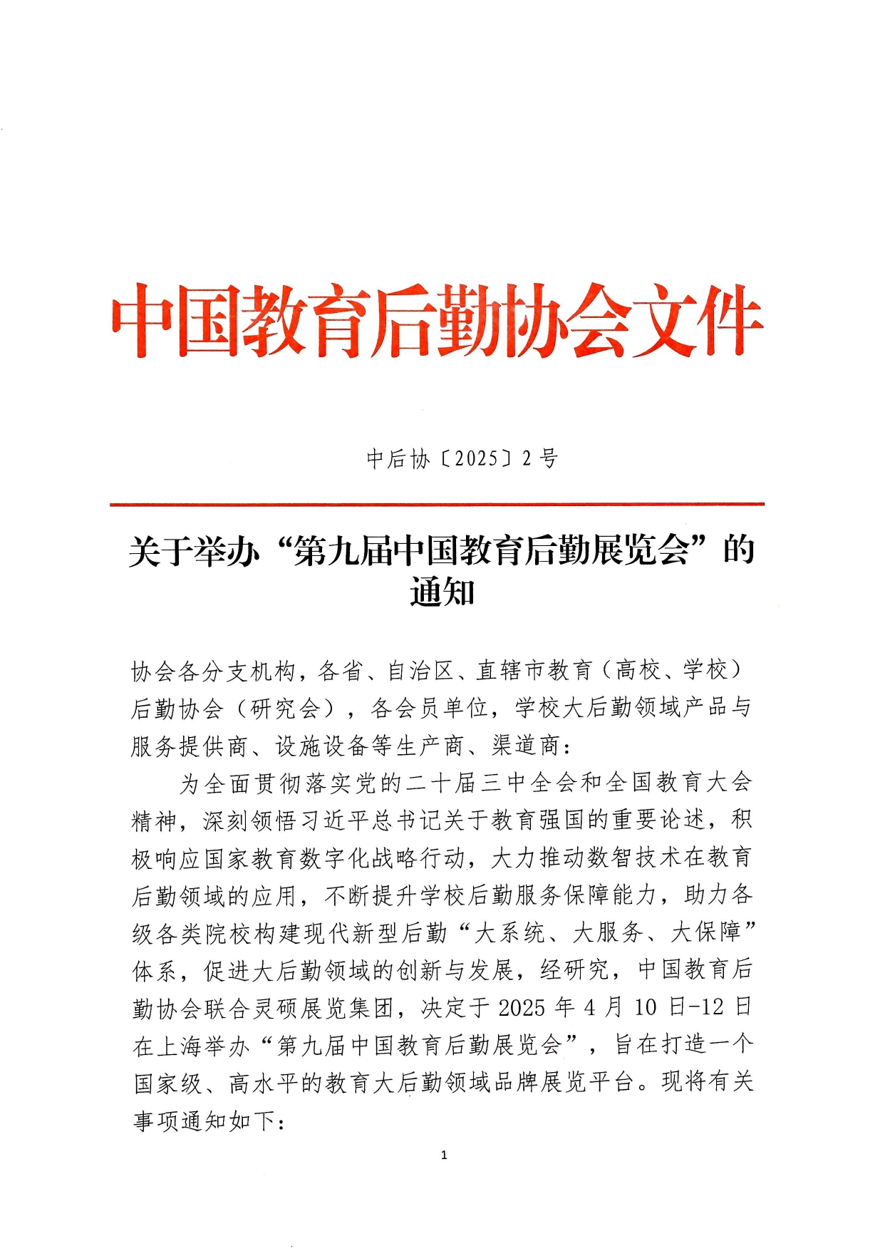 为全面贯彻落实党的二十届三中全会和全国教育大会精神,深刻领悟习近平总书记关于教育强国的重要论述,积极响应国家教育数字化战略行动,大力推动数智技术在教育后勤领域的应用,不断提升学校后勤服务保障能力,助力各级各类院校构建现代新型后勤“大系统、大服务、大保障”体系,促进大后勤领域的创新与发展,经研究,中国教育后勤协会联合灵硕展览集团,决定于2025年4月10日-12日在上海举办“第九届中国金年会览会”,旨在打造一个国家级、高水平的教育大后勤领域品牌展览平台。现将有关事项通知如下: