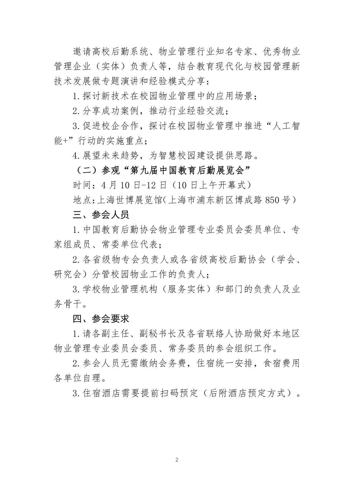(一)举办“校园物业管理新技术应用发展论坛——科技赋能,智慧校园——物业管理新未来”(11日上午)邀请高校后勤系统、物业管理行业知名专家、优秀物业管理企业(实体)负责人等,结合教育现代化与校园管理新技术发展做专题演讲和经验模式分享:1.探讨新技术在校园物业管理中的应用场景;2.分享成功案例,推动行业经验交流;3.促进校企合作,探讨在校园物业管理中推进“人工智能+”行动的实施重点;4.展望未来趋势,为智慧校园建设提供思路。(二)参观“第九届中国金年会览会”时间:4月10日-12日(10日上午开幕式)地点:上海世博展览馆(上海市浦东新区博成路850号)
