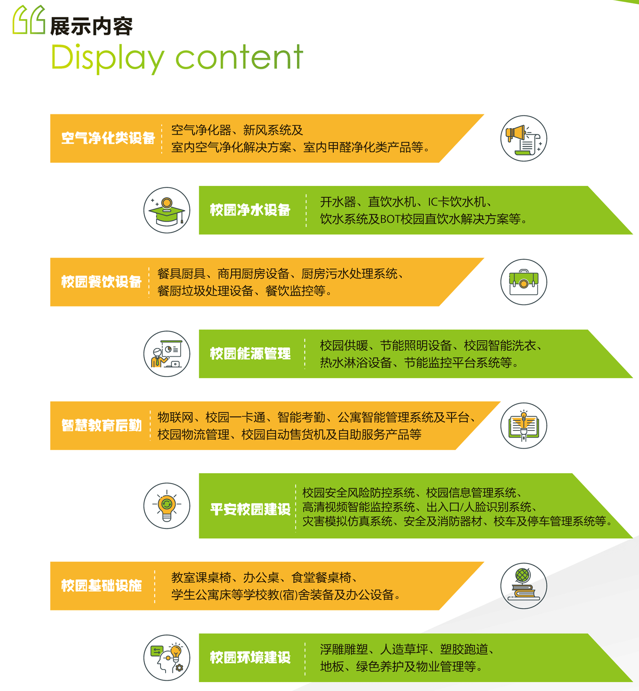 1.展示展览教育后勤餐饮、物业、公寓、安全、信息化建设、新业态、智慧后勤等各领域相关设备、产品、服务等;