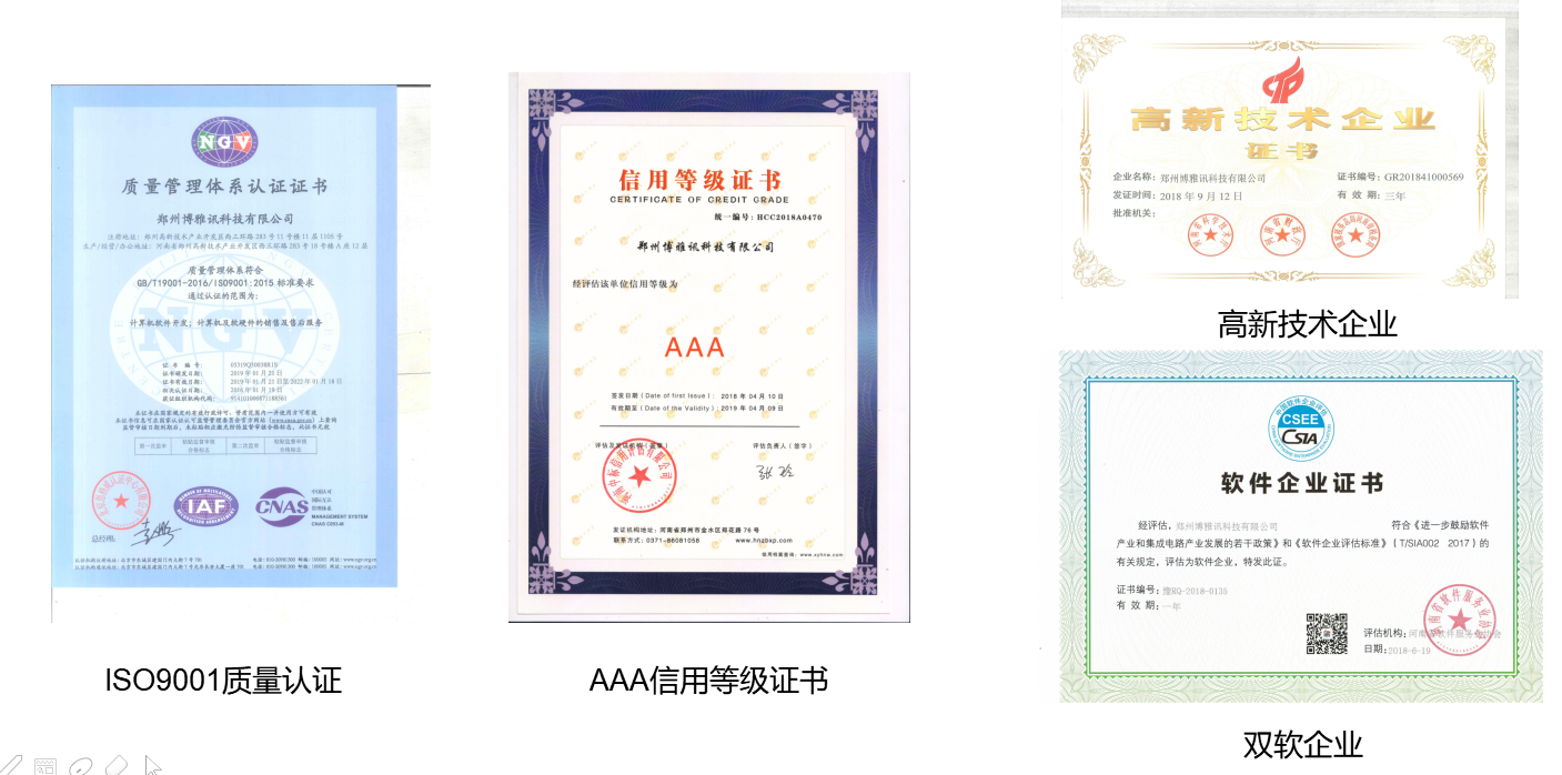 公司通过了AAA信用等级、ISO9001质量管理体系,ISO27001-2013信息安全管理体认证、双软认证等资质,自主研发软件著作权30多项,专利证书10多项。