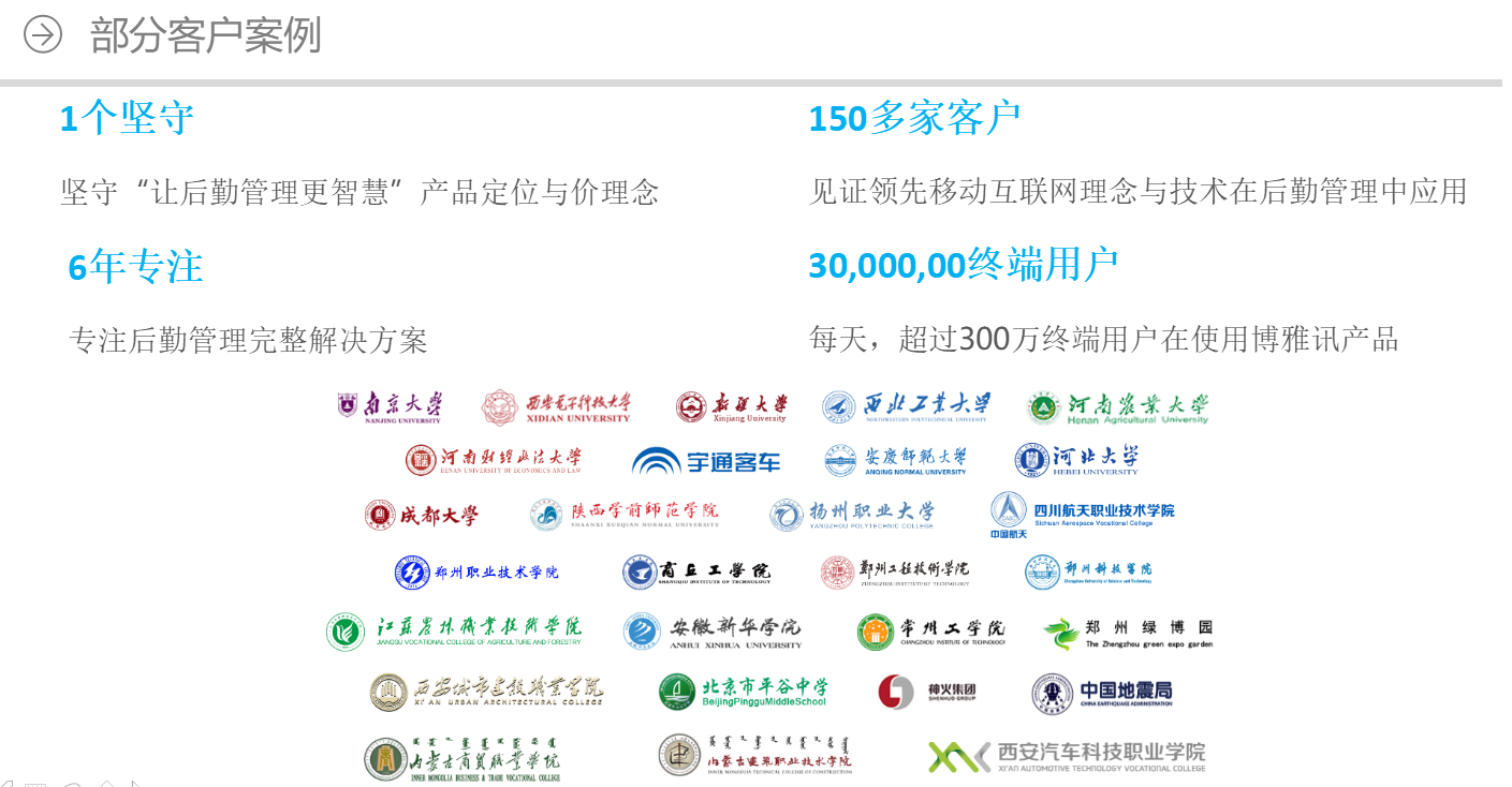 公司主要产品有云后勤服务平台、智能门锁、智能水电控管理系统、公寓管理系统、智能烟感、物联网关、人脸识别闸机、数据网关、网络报修、服务监督、网上订餐,失物招领、资产管理、房产管理、班车预定、三维管线、人力资源、云后勤app、智慧漏检、基于场景物联网平台、基于场景物联网运维平台等;所有产品均拥有自主知识产权,博雅讯以移动互联、物联网、云计算、大数据等技术为基础,针对后勤管理、监督和服务的特点,面向人员,通过对资源“共享、互通”,构建以“服务”为核心的“智慧后勤”;面向人员提供全天候、高效率、个性化的新型后勤服务,构建精细化、规范化和人性化、信息化、智能化的后勤服务保障体系。